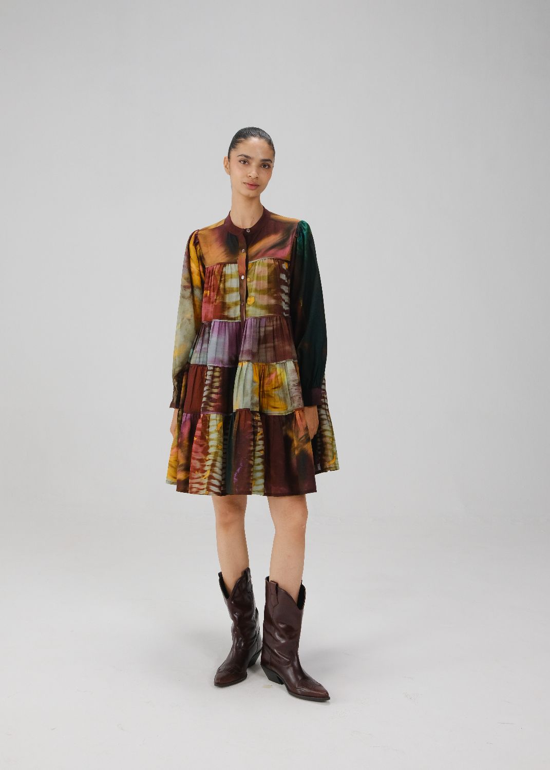 Details: Front button fastening, Contrast piping on each tier Collar: Band Collar
