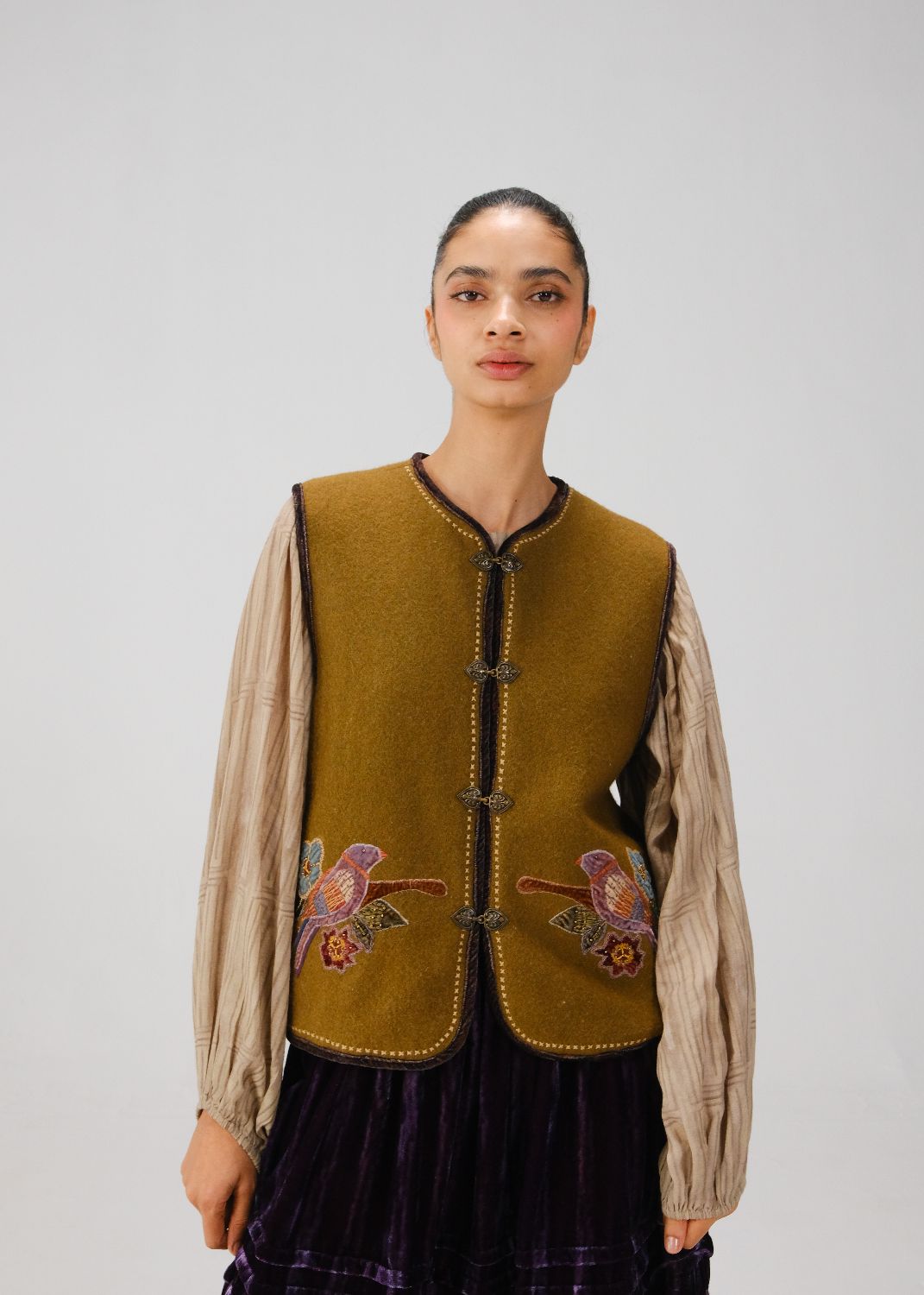 The Vest features a round neck, contrasting piping, lace borders, vintage metal buttons, and front button fastening. Intricate hand embroidery enhances the work across the bodice, adding a refined artisanal touch.