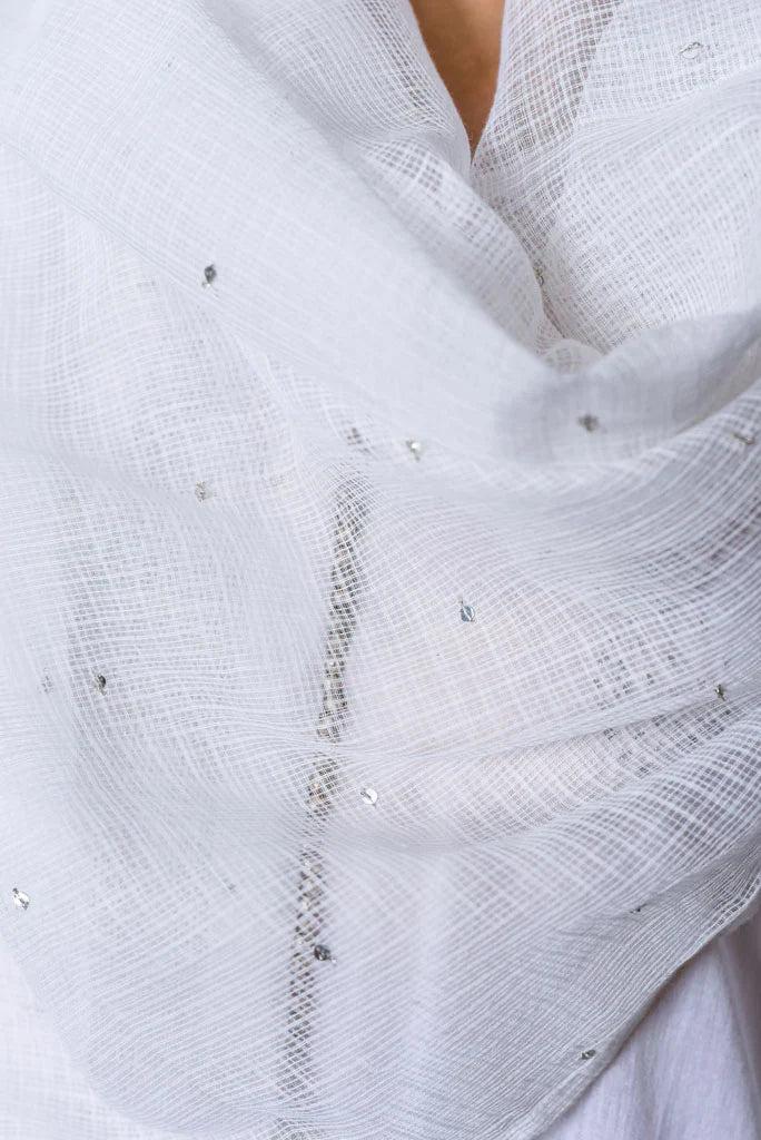 Cotton mul-mul, round edged long kurta, with hand hemmed silver ghungroos on the placcate and delicate silver "chaand" motif shadows emboirdered all over the front. Sleeve has mukaish work and monotone thread detailing. Dupatta is handspun kota silk with silver lace and mukaish chaand embroidered on it. Outfit is paired with an old fashioned narrow high salwar with hand embroidered sequins.