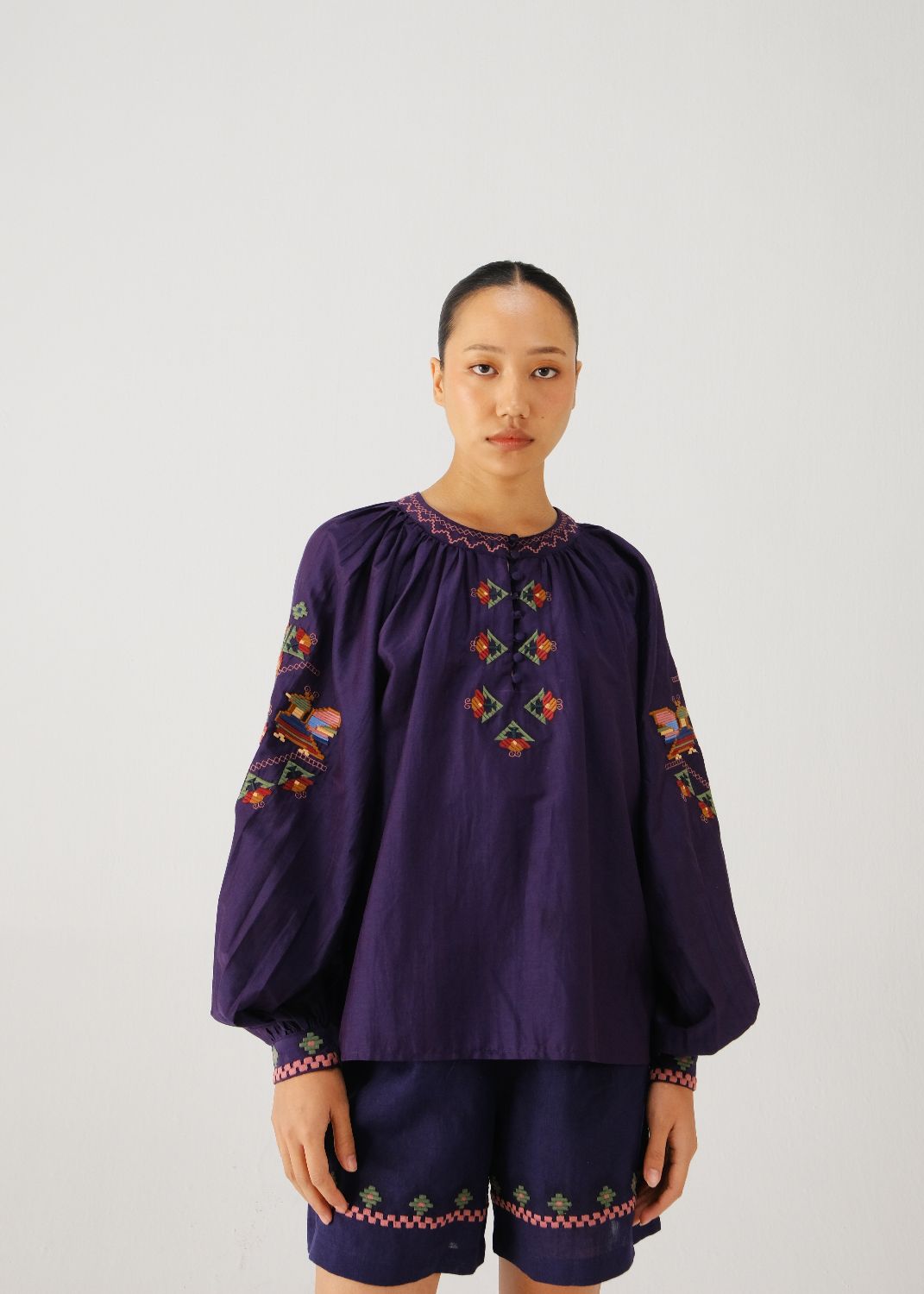 The Lido top is made from a cotton silk fabric. It has a gathered neckline and bishop sleeves with cuffed ends, creating a soft silhouette. The top features intensive folk embroidery on the neck and sleeves.