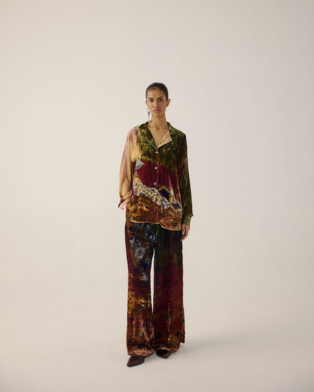 The Lounge shirt is made from Velvet fabric in Lakeside print. It is a button-down shirt and has notched collar detailing. The lounge pants are made from Velvet fabric in Lakeside print. It features a button and zip fastening along with pleats in the front, and an elastic waistband at the back