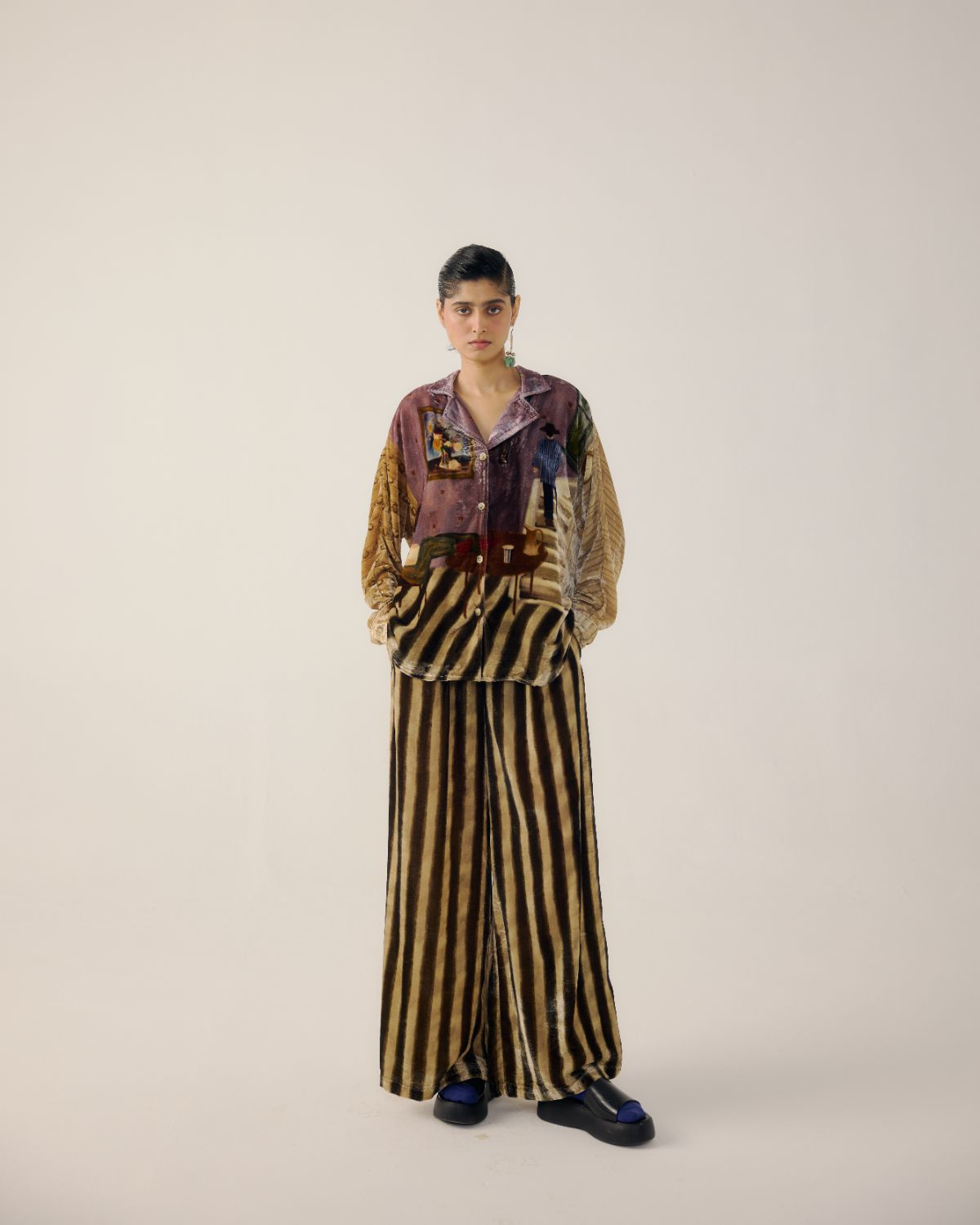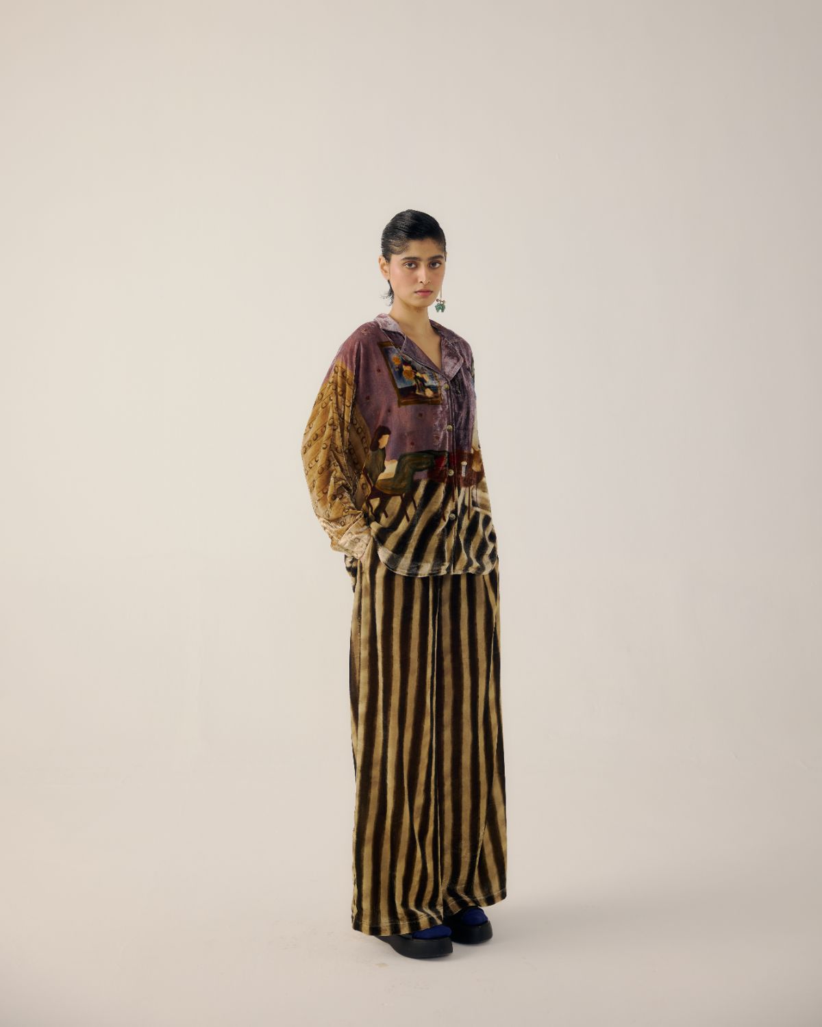The Lounge shirt is made from Velvet fabric in Living room print. It is a button-down shirt and has notched collar detailing. The lounge pants are made from Velvet fabric in Black and white stripes print. It features a button and zip fastening along with pleats in the front, and an elastic waistband at the back
