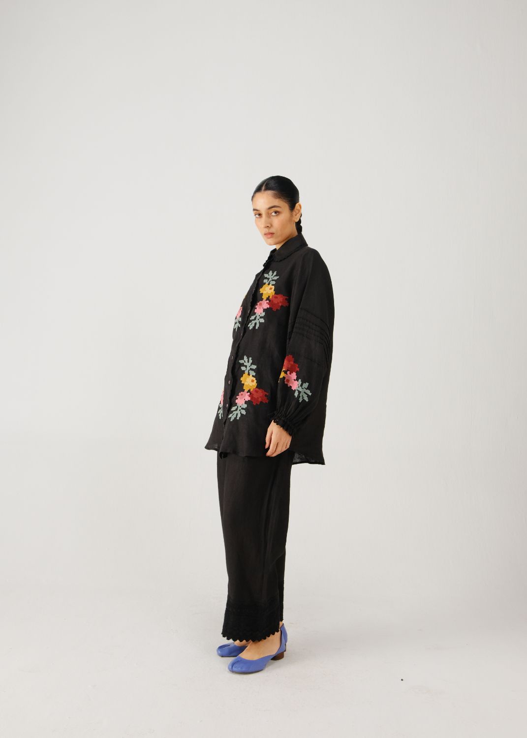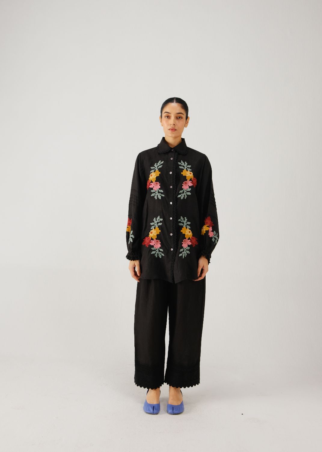 Moira Set consist of Moira shirt in black pixel emb. with intricate floral embroidery that covers the entire front panel and the cuffs. Delicate lace details are stitched along the collar, placket, and cuffs, creating a sophisticated and feminine look. Paired with Drawstring pants featuring Lace hem detail.