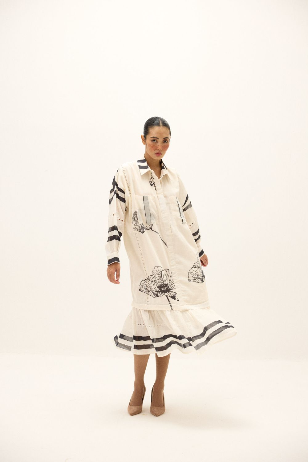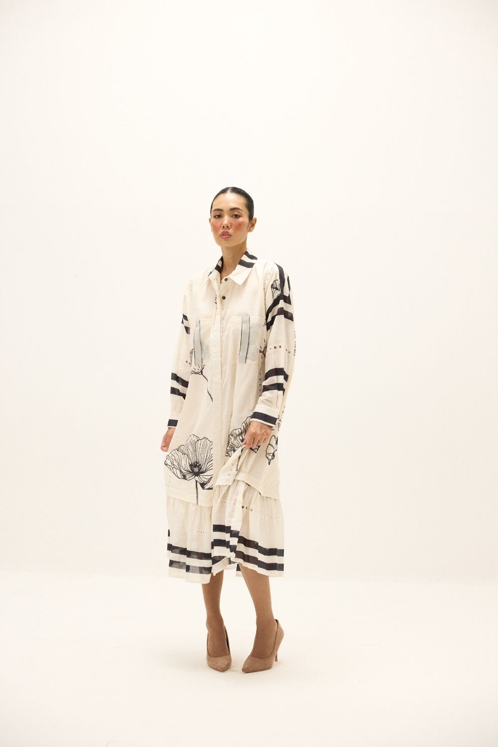An airy, relaxed shirt dress in soft mul cotton, featuring bold hand-drawn florals and contrasting stripe detailing. Designed with delicate eyelet inserts, concealed placket, and a tiered hem, it blends structure with fluid movement for an effortlessly elevated look.