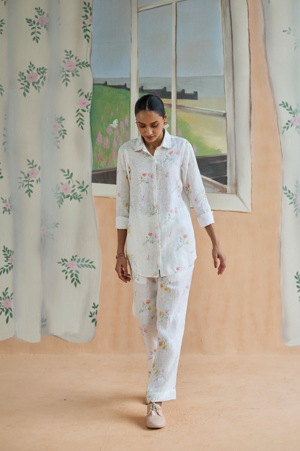 100% linen shirt-pant set embodies the elegance of ease, designed for those who value both comfort and effortless grace. Scattered floral motifs, placed with intention to feel almost spontaneous. A relaxed fit, the shirt drapes fluidly, while the tailored yet easy pant completes the set, creating a balance of structure and softness that feels modern yet timeless. Pockets add an essential convenience.