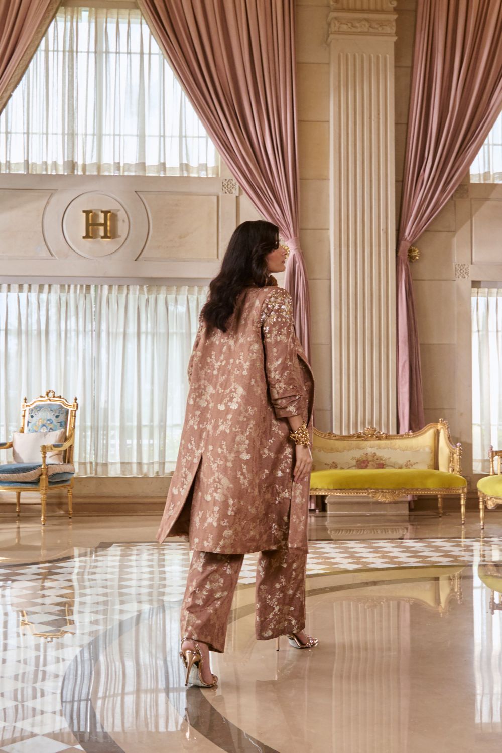 A fresh addition to our festive lineup elevate your festive style with this elegant jacquard co-ord set, featuring tailored pants, a refined blouse, and a statement jacket adorned with intricate hand embroidery. This versatile ensemble blends traditional craftsmanship with modern structure.