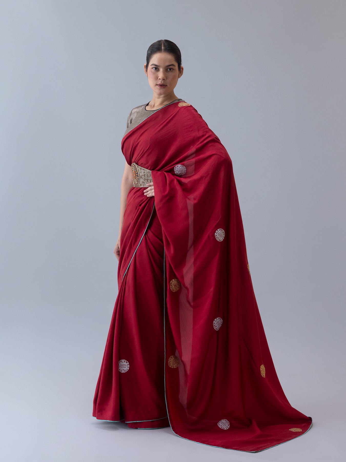 Drukyul saree is marked by modern craft, featuring silk Habutai fabric with intricate laser-cut tissue motifs, a structured haze shantoon piping, and a gold-faced border balancing flow and structure. Country of origin: India