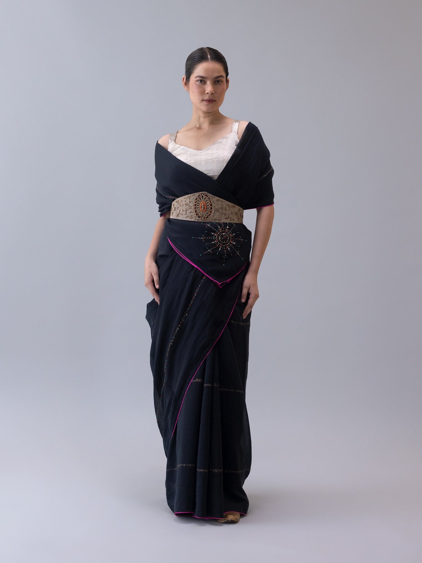 Gyanak saree makes a bold statement, featuring fine Chanderi fabric with gold motifs, intricate glass beadwork, and neon pink piping against black for striking contrast. Country of origin: India