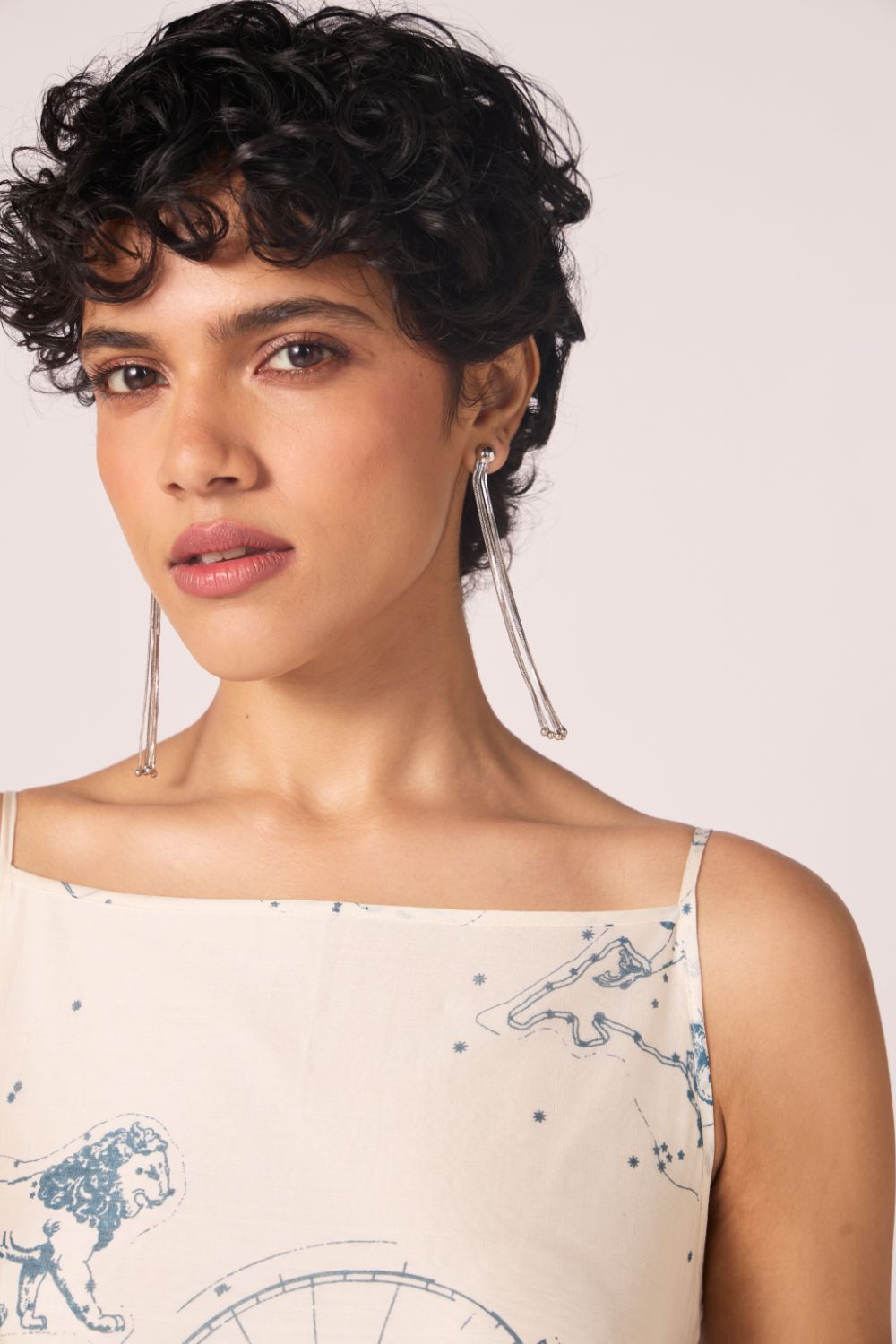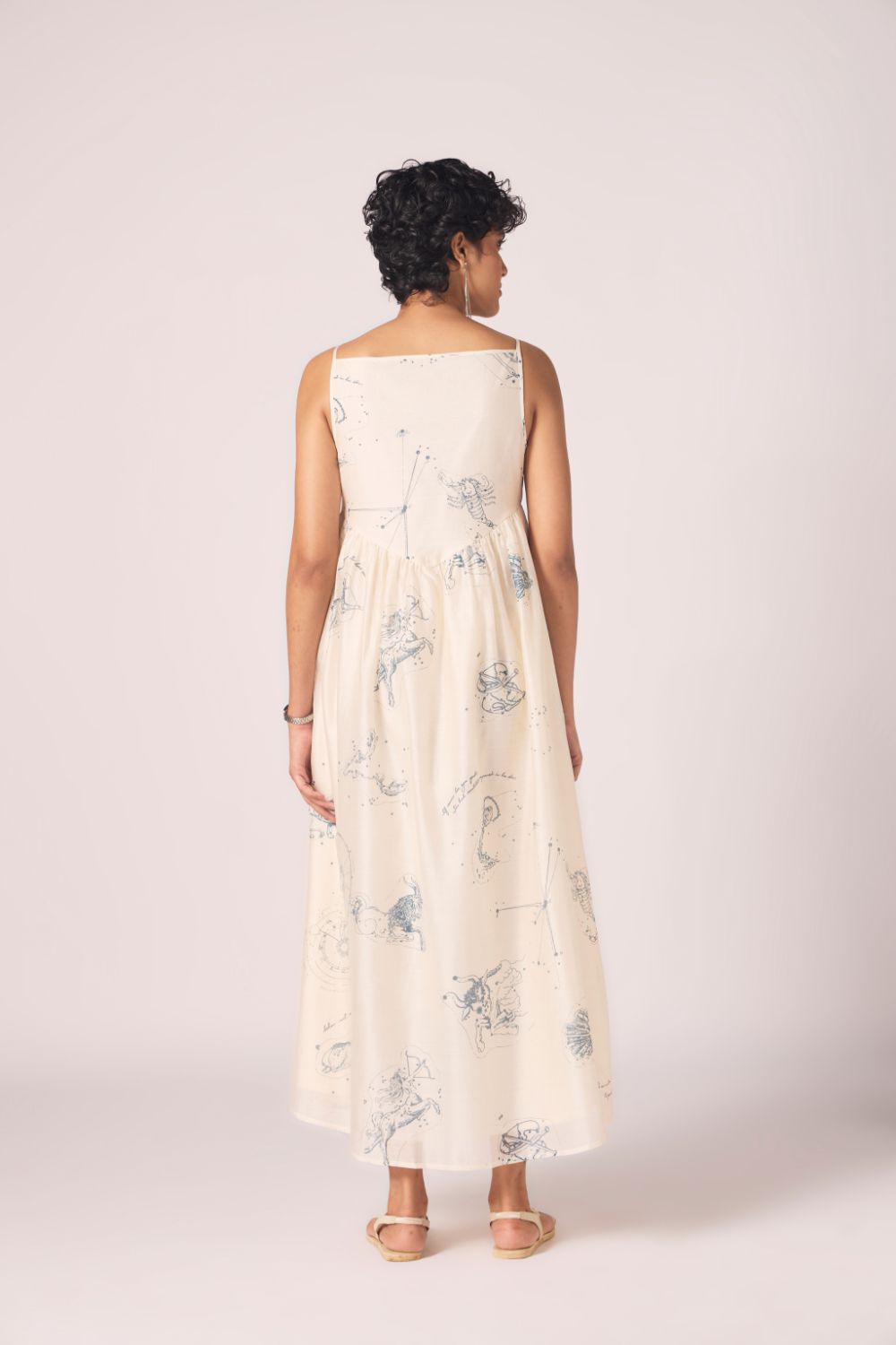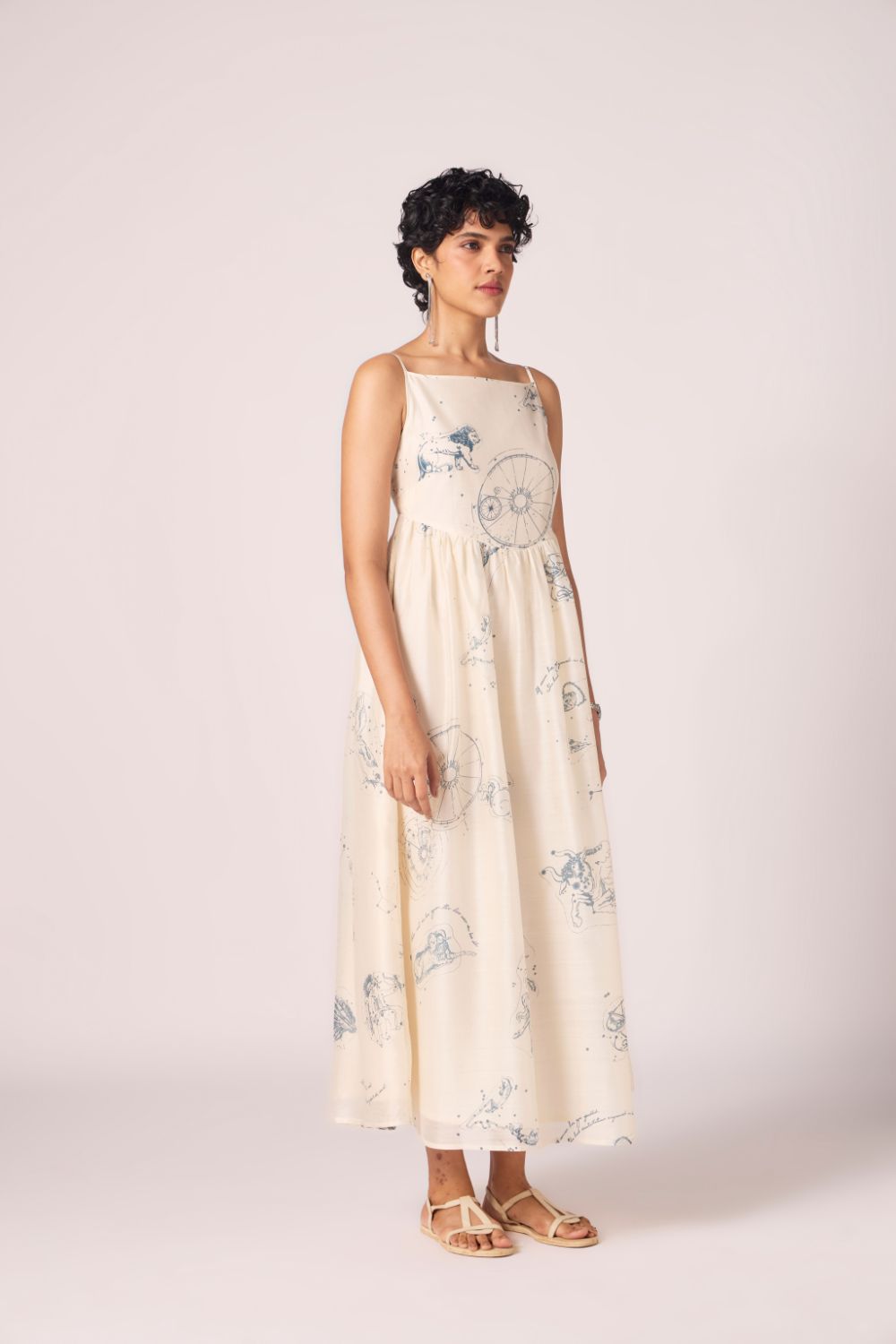 Constellations scattered across handwoven Chanderi. The fitted bodice shapes cleanly before opening into a flared hemline that holds both poise and motion. A dress that balances structure with lightness.