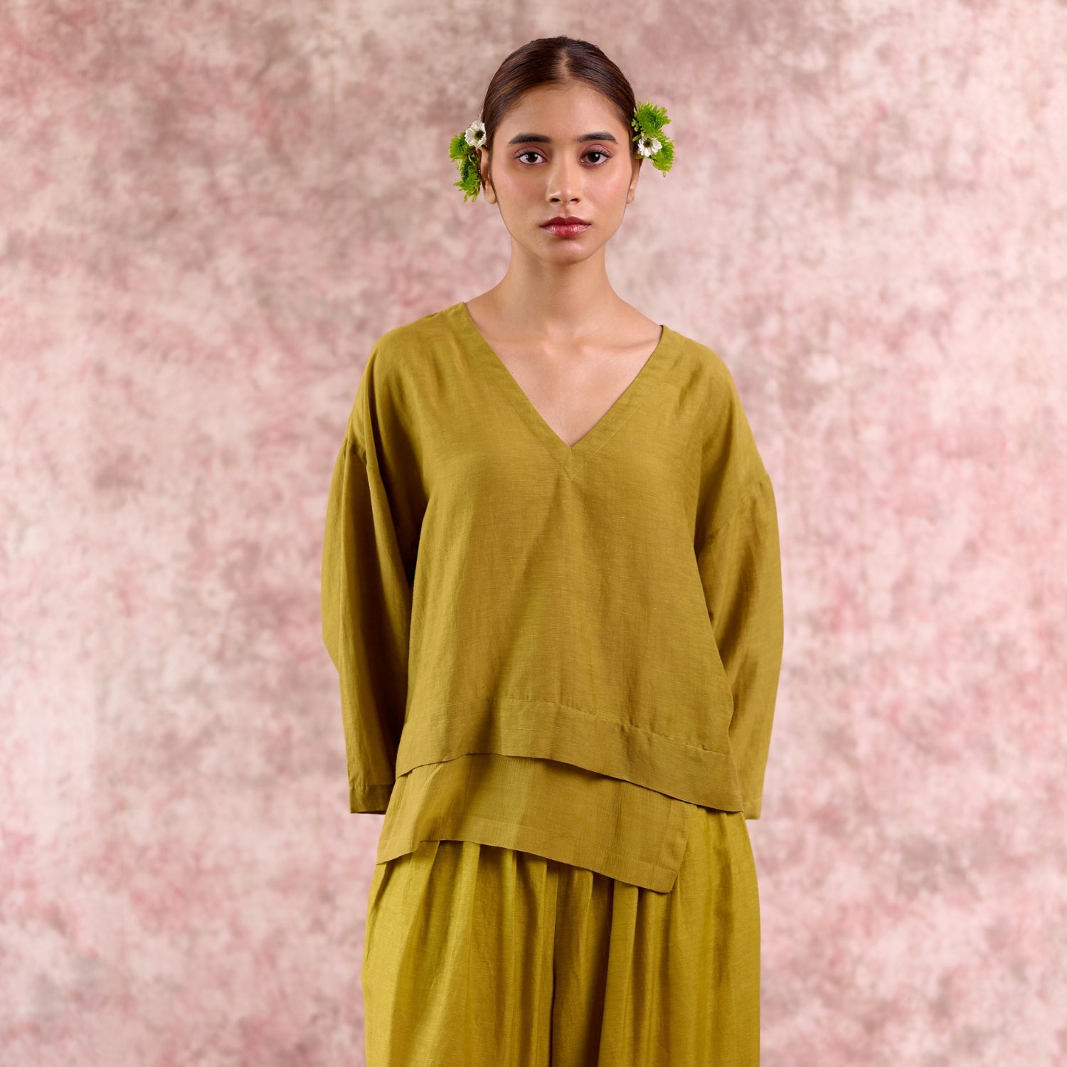 A flowy festive top crafted in green dyed Bemberg linen georgette (recycled fabric) . Featuring a V-neckline, relaxed fit, and a layered hemline, this piece drapes beautifully for effortless elegance. Lightweight and breathable, it transitions seamlessly from festive occasions to everyday wear.