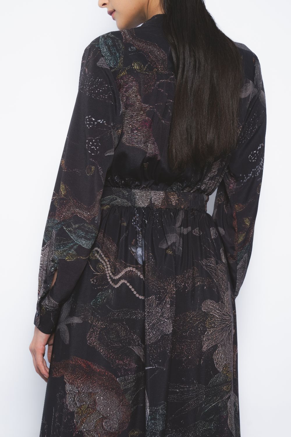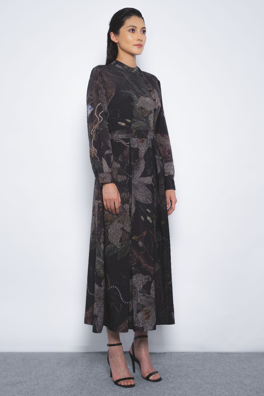 Merging elements of vegetation, the sea, and the stars, this artistic print evokes a balance of elegance and boldness. The style reimagines a classic silhouette with a contemporary edge, defined by its asymmetrical placket placement.