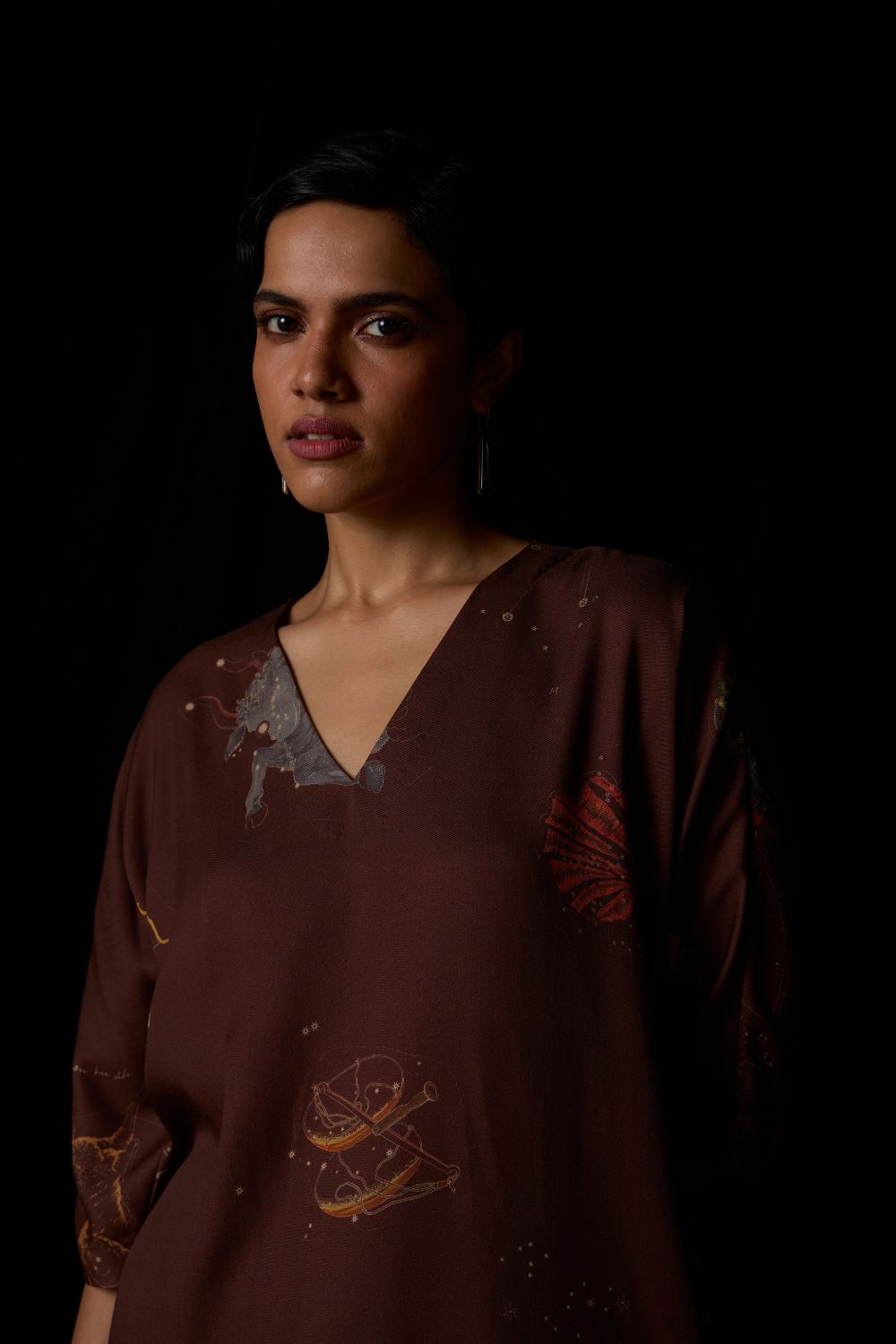 - Shift silhouette; V-neck; Kimono inspired sleeves